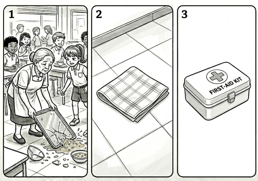 Then, I ran as fast as I could to the General Office to get the school’s first-aid kit. I brought it back and carefully helped her put a plaster on her cut. After that, I grabbed a broom and helped her sweep up the broken bowls so nobody would step on them and get hurt.
