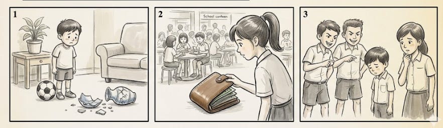 A naughty thought entered my mind. I could use this money to buy the latest video game. My heart beat fast as I put the wallet into my pocket. But then, I saw the canteen auntie looking very worried. She was looking under the tables and crying. I felt a big lump in my throat. I knew I was being selfish.