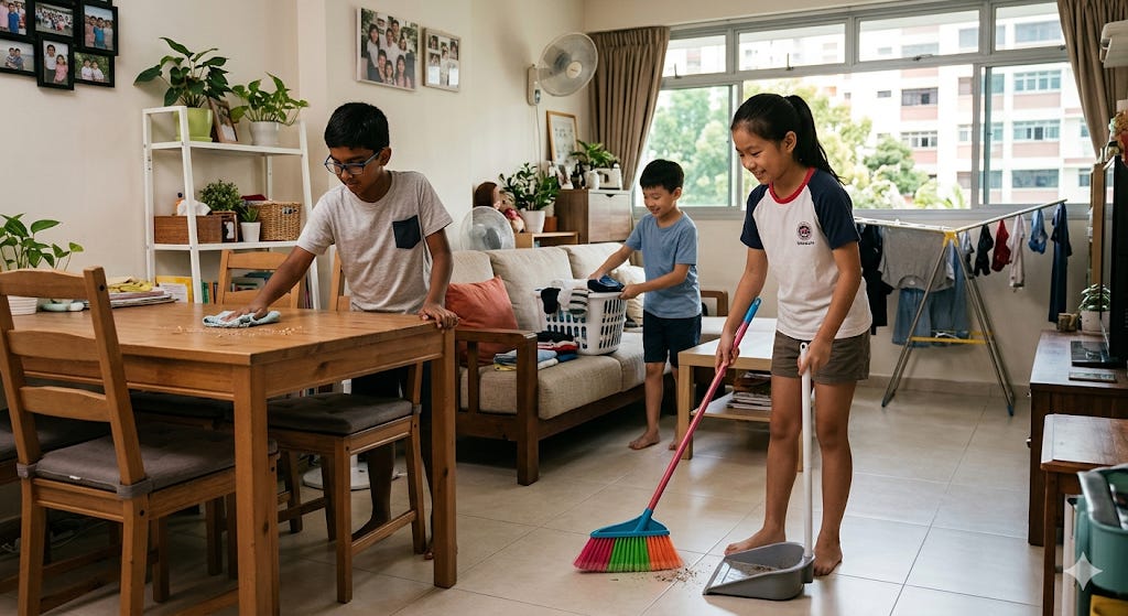 Wei Ming is in charge of the heavier tasks. He handles the vacuum cleaner with precision, ensuring not a single speck of dust remains under the sofa. Meanwhile, Shanti takes pride in organizing the bookshelf and wiping down the dining table until it gleams. Even though the work can be tiring, the siblings often turn it into a game, seeing who can complete their chores the fastest.