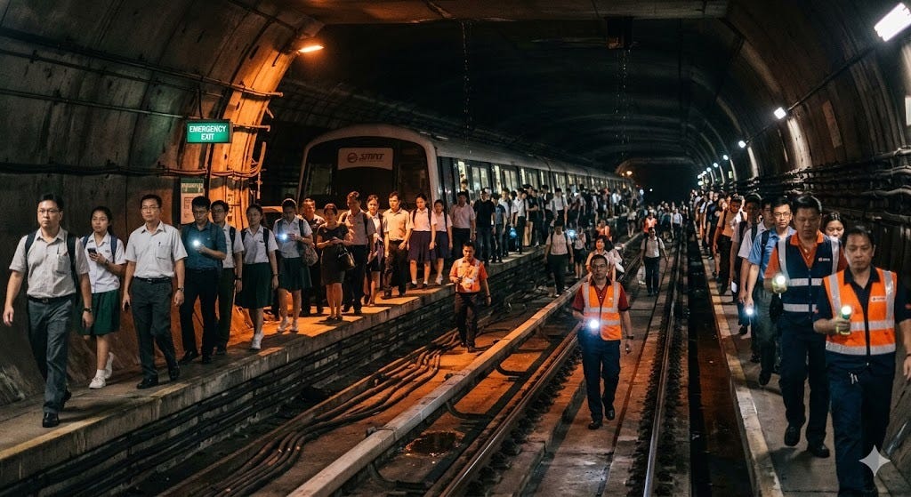 The train came to a sudden, grinding halt inside the dark tunnel. The usual reassuring hum of the air conditioning was quickly replaced by a profound, anxious silence. A muffled voice crackled over the PA system, announcing a major train breakdown and that all passengers must evacuate. Commuters, a mix of office workers and students, initially looked at each other with confusion, which swiftly turned into shared resignation. SMRT staff, recognizable in their bright orange and navy blue vests, worked with admirable calm. They guided the passengers out of the doors and down small metal ramps onto the concrete track bed. As they walked single-file along the dark railway, illuminated only by dim emergency lights and the narrow beams from their phone flashlights, the gravity of the breakdown became clear. Many students, some still carrying heavy school bags, checked their watches frequently, worrying about their exams. One student, walking carefully on the ballast, remarked, "This is not how I pictured my journey to school!"