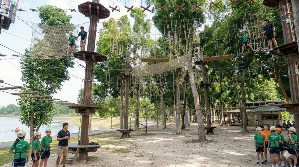 The sun beat down on the lush greenery of the adventure campsite as the Primary Five students gathered for their most daunting challenge yet. Dressed in their bright green camp tee-shirts, the children looked up at the towering high elements course with a mixture of awe and nervous excitement. Safety was the top priority; each student was meticulously fitted with a sturdy helmet and a secure body harness.
